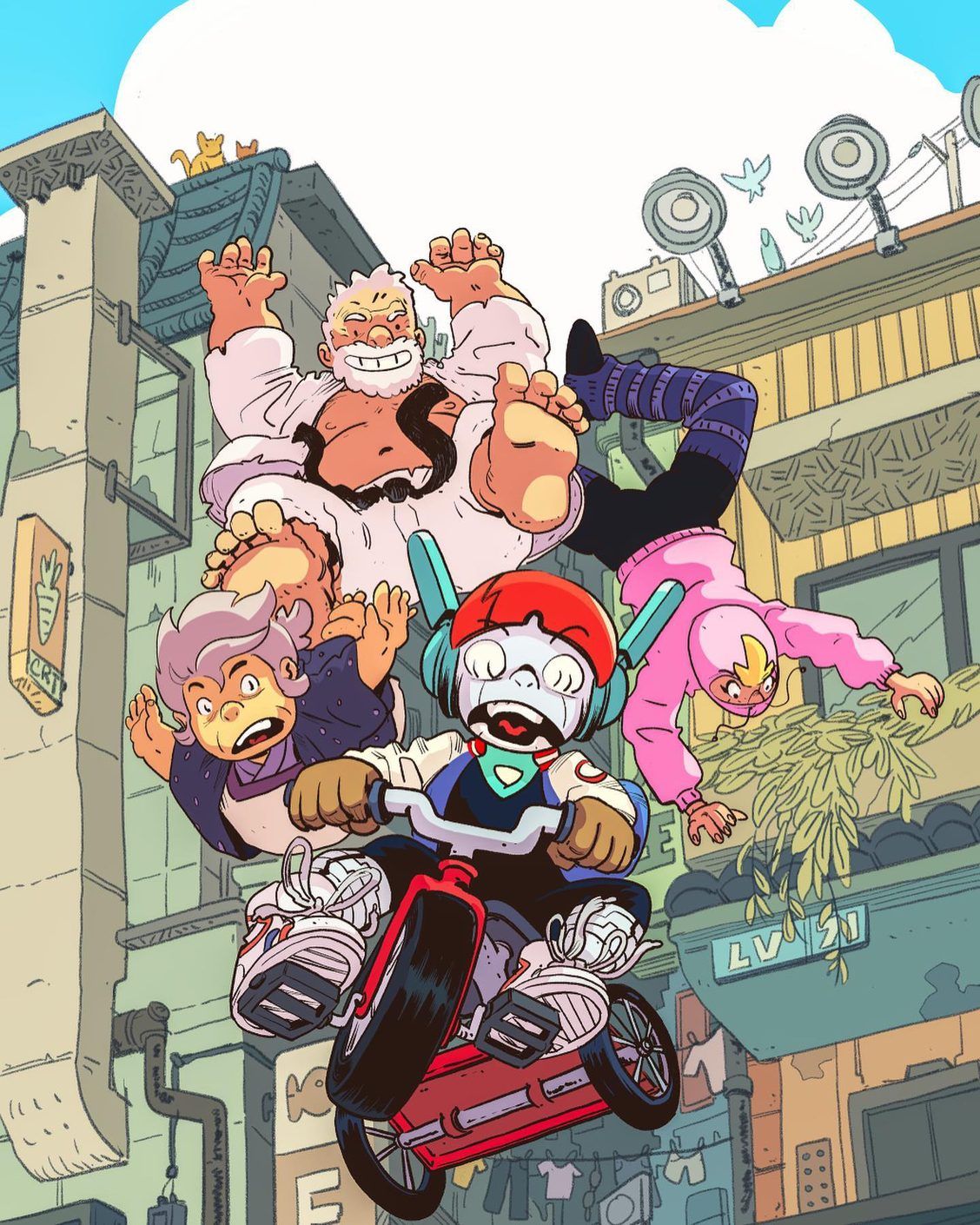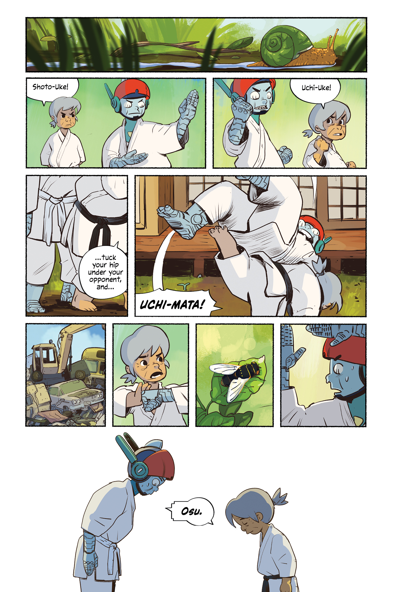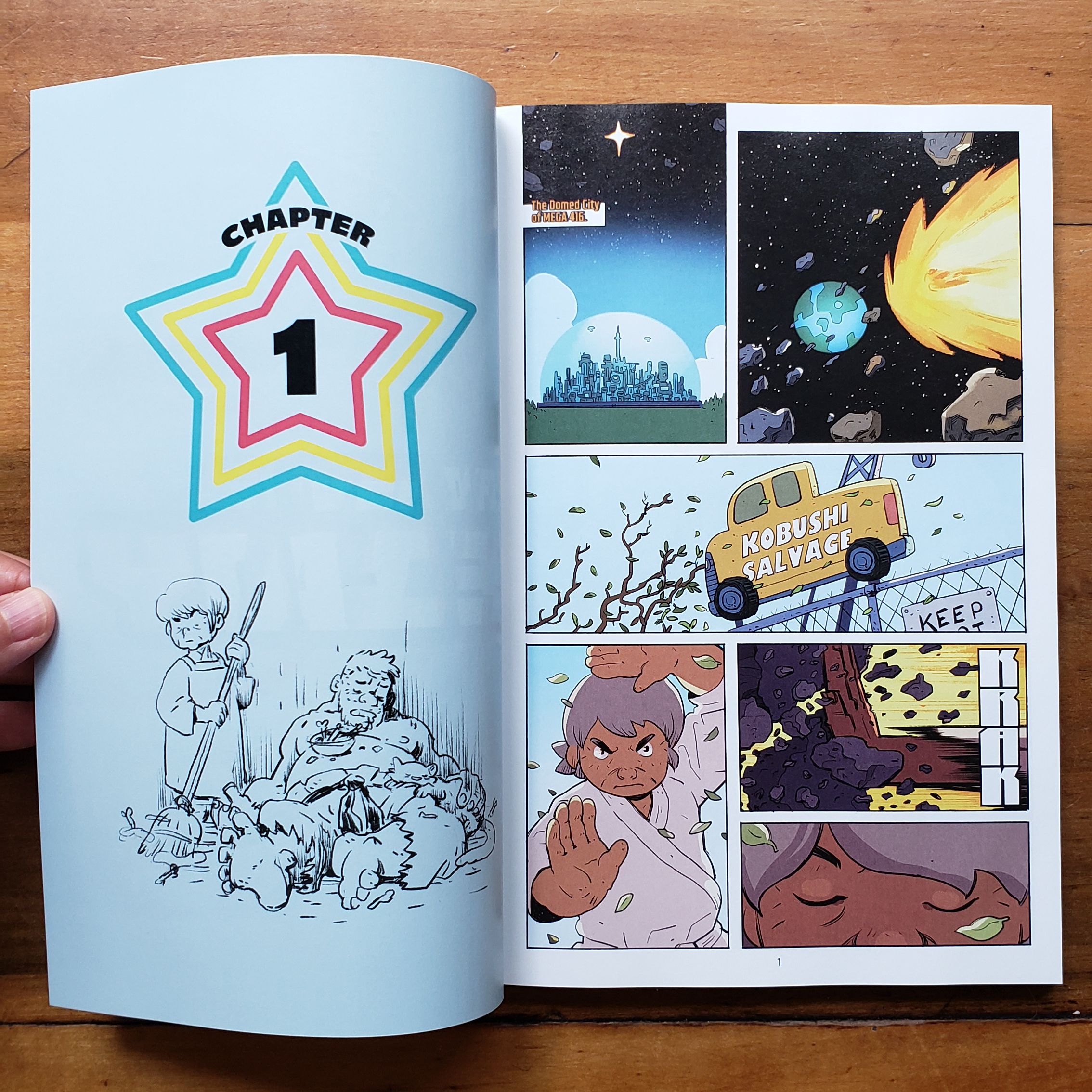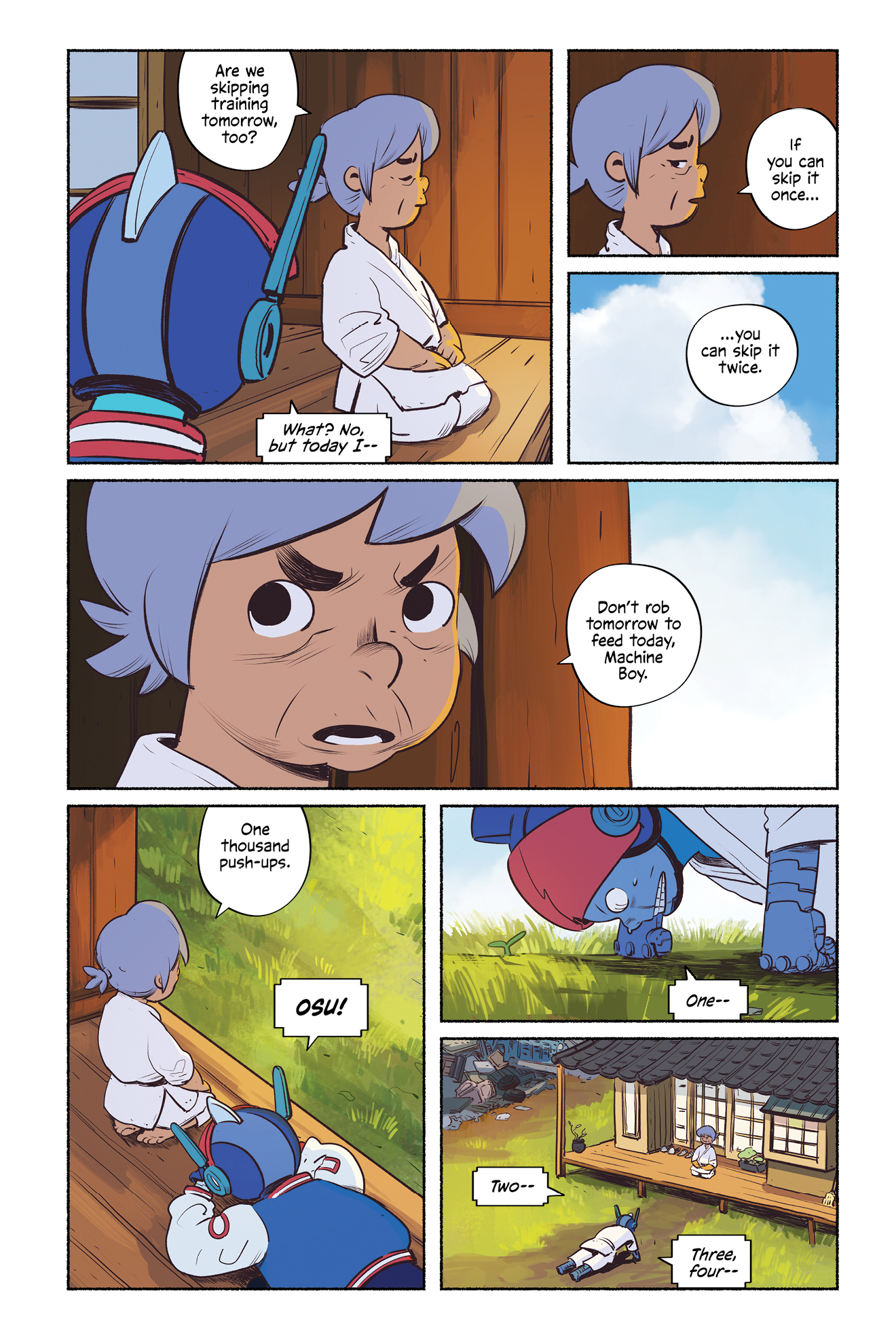 “Everyday Hero Machine Boy” is about a little robot that crashes into the domed city of Mega 416, unintentionally wreaking havoc on it’s hapless citizens until his heart is awakened by an old man’s Karate punch. Now raised and trained in the ways of the Empty Fist by the old man’s widow, Machine Boy has to overcome interstellar threats, neighborhood squabbles and the most difficult ordeal of them all…simply growing up in a world that sometimes doesn’t want to accept him.