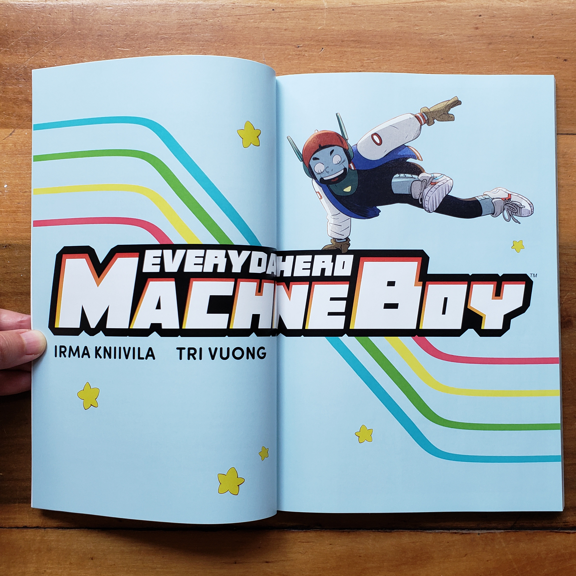 “Everyday Hero Machine Boy” is considered a middle grade book for children aged 8 to 12 but Irma Kniivila (my co-creator) and I didn’t write the book with a particular audience in mind. We were interested in telling a coming of age story fueled by our experiences as children of immigrants, and informed by a heavy dose of nostalgia for the pop culture of the 80’s and 90’s. Our fond memories of 16-bit RPGs, obscure pop music, and the anime and manga we grew up reading, all coalesced in “Everyday Hero Machine Boy”.