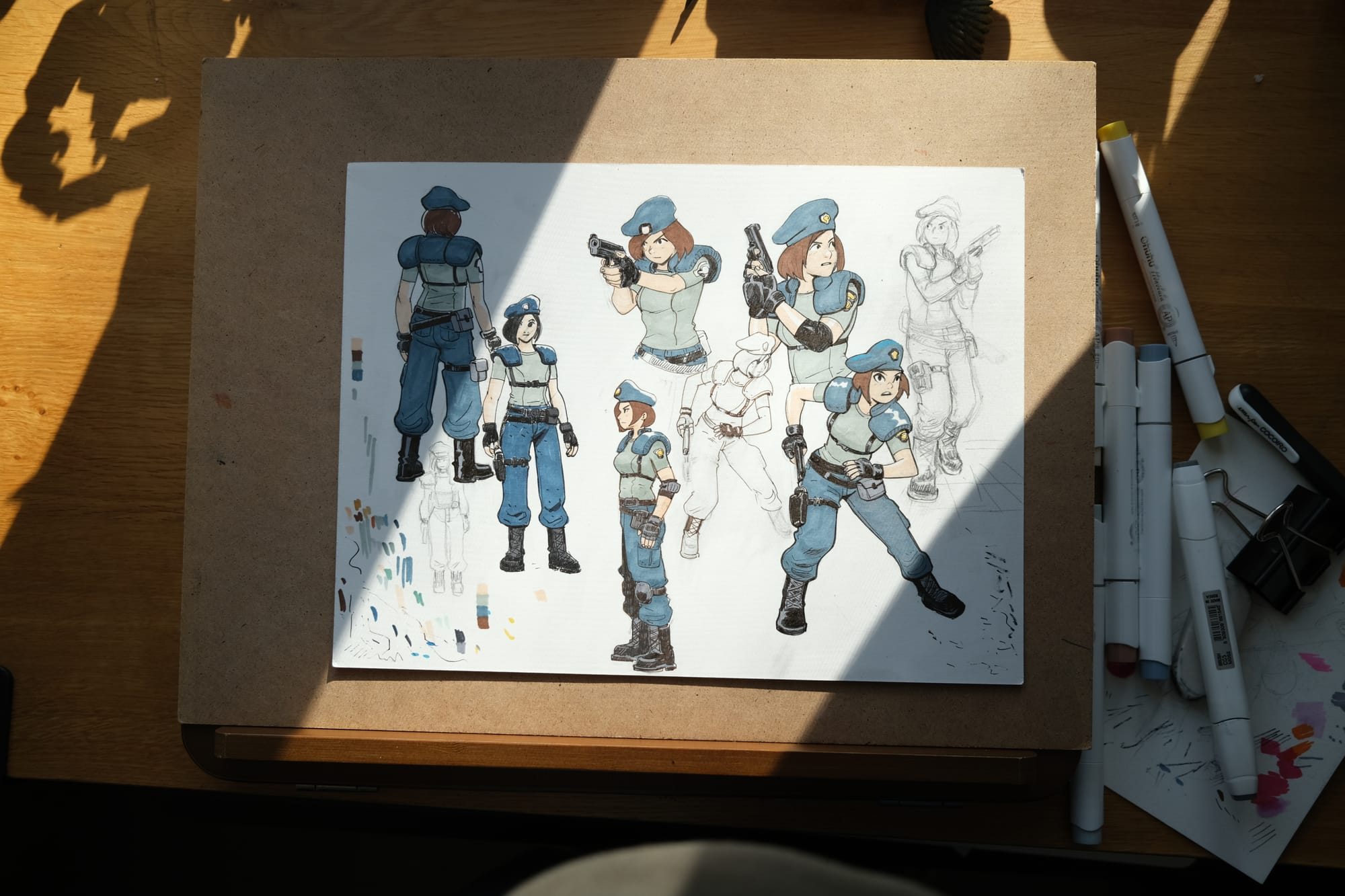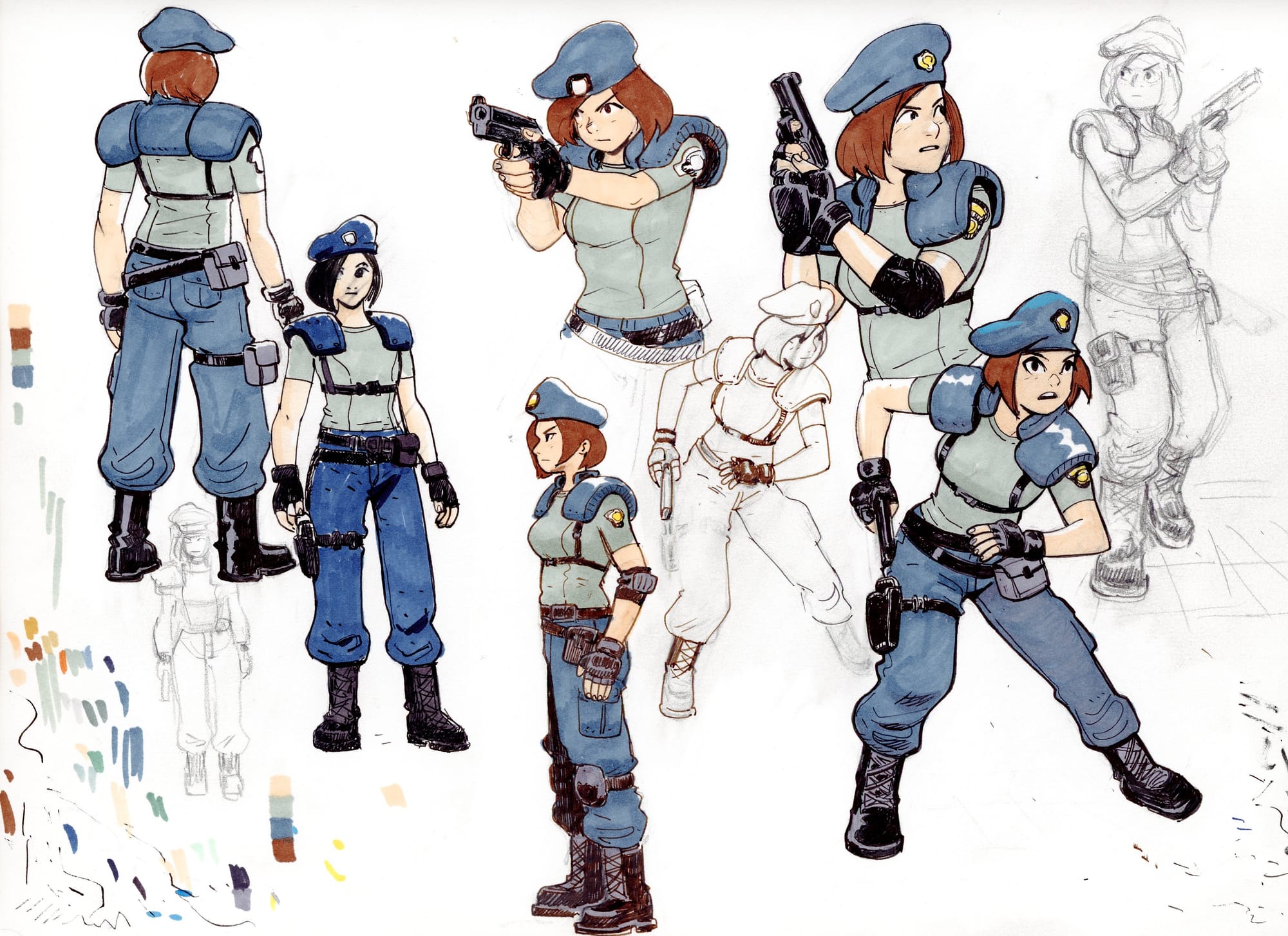 Lately, I've been playing a lot of survival horror games as research for Oscar's new story (tentatively titled "The Hollow Shores). So of course, my morning doodles largely consist of Jill Valentine from the first Resident Evil: