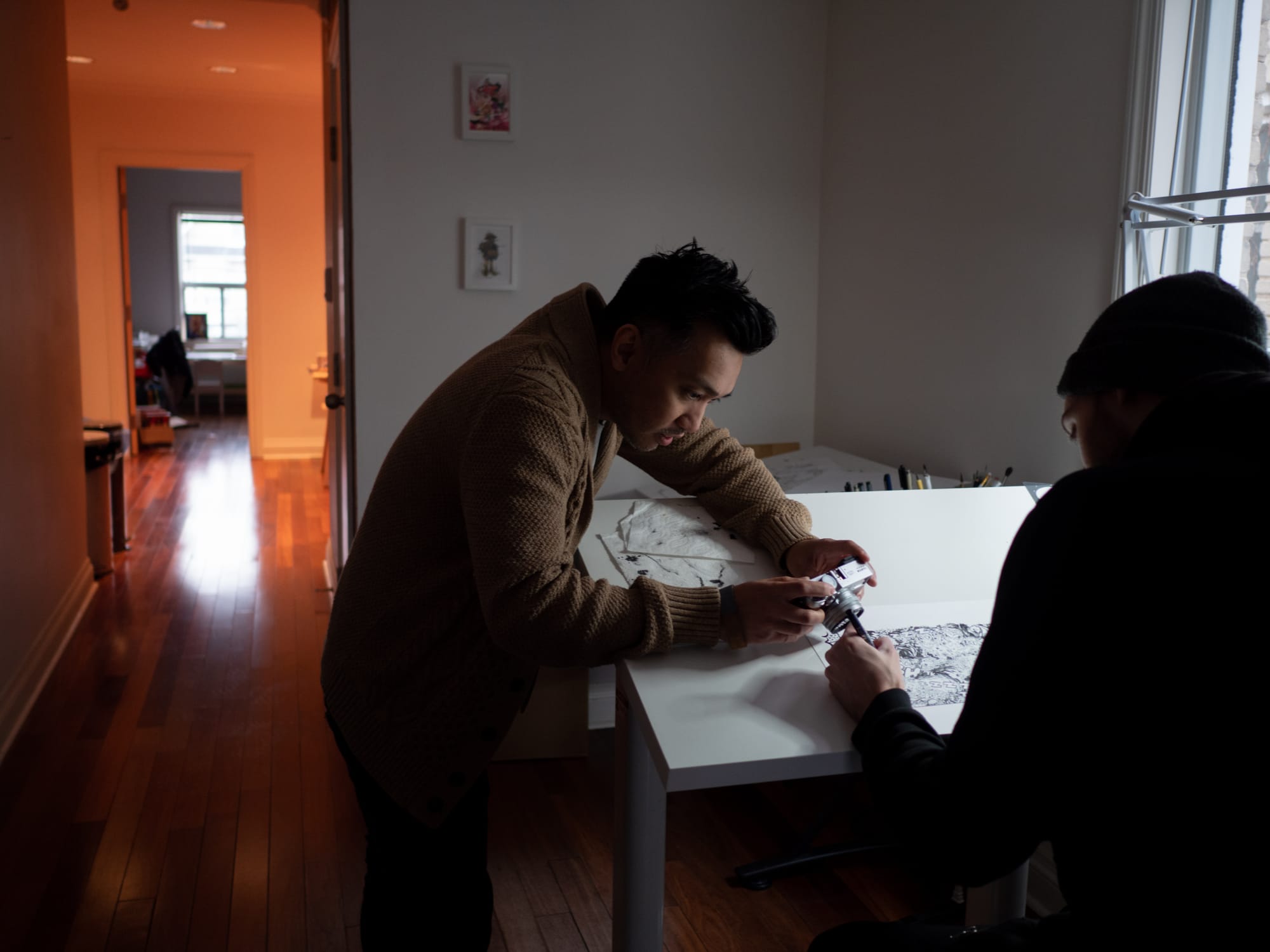 The space was massive—way bigger than what we needed. Francis and I used to skateboard across the studio, past our private bathrooms and through the kitchen to get into each other’s spaces to chat. We definitely had room to stretch our legs and took full advantage of that by setting up giant work areas with multiple computers and drawing desks.